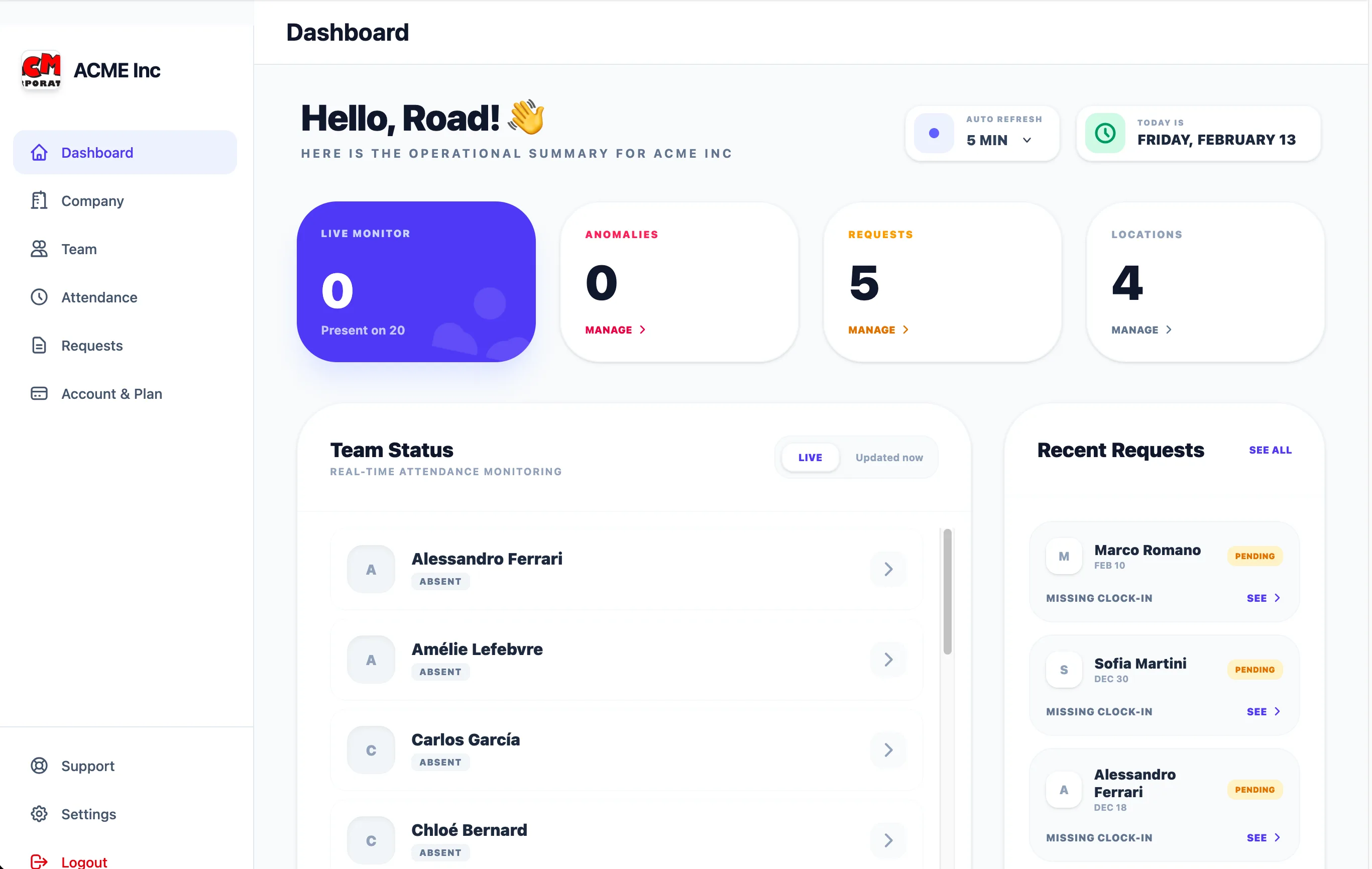 Visualizza l'intero team in tempo reale. Gestisci presenze e assenze all'istante dalla tua dashboard.